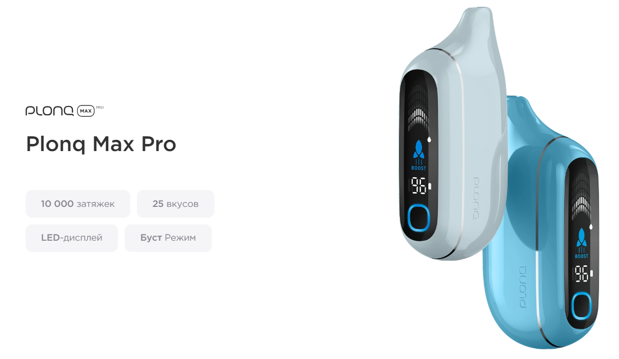 Бренд одноразовых систем курения Plonq активно завоевывает как любовь пользователей, так и рынок в целом. Потребителю всегда хочется чего то нового. Компания Plonq сейчас представила на рынок 7 линеек, от 600 затяжек до 25 000. Plonq Max Pro 10000 из названия все понятно, девайс рассчитан на 10 000 затяжек. Не смотря на то, что это одноразовая система доставки никотина, функций у нее не меньше чем у стандартного девайса. Пользователь может отслеживать уровень заряда, количество оставшейся жидкости и даже менять режим мощности. Boost режим позволяет временно увеличить мощность для большего вкуса. Так же устройство можно заблокировать нажав 5 раз на кнопку активации. На самом деле, это все лишнее и увеличивает стоимость одноразового девайса... Поэтому, сложно назвать это каким то преимуществом, пользователю такой сегмент хотелось бы приобретать максимально дешевле.
